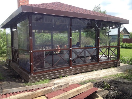 Более прочная и эластичная пленка, но стоит заметно дороже, чем ПВХ. Из него можно делать целые прозрачные стены. Популярен при остеклении летних кафе, террас ресторанов, прочих заведений, где проходит много людей, присутствует большая нагрузка на материал.
